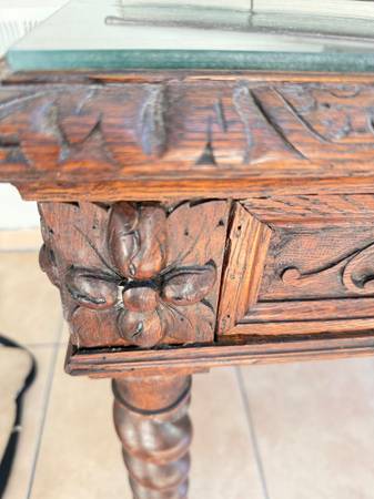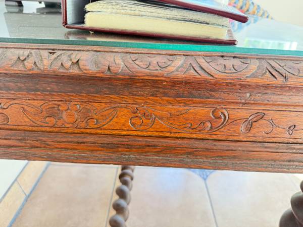 Beautiful antique desk measures 45 1/2 L X 35D X 30H. Detailed carving around edge with additional detail on each drawer. Glass top included. Paid $1,800, must sell for $550.00. Moving and must part...