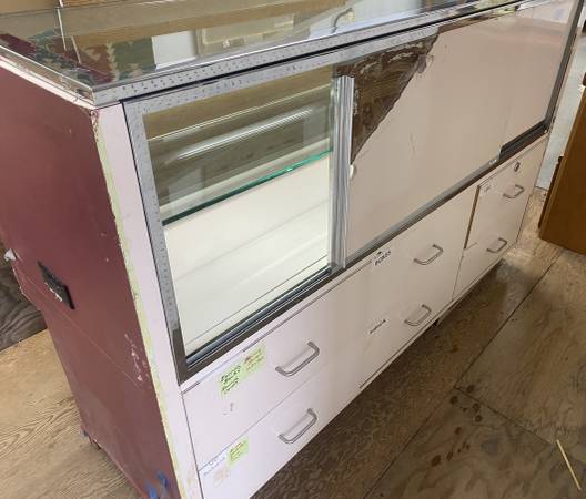 COUNTER DISPLAY CABINET. This powerful cabinet is 59 inches long and 49 inches high. This cabinet has been in our store for several years and has served us well (found one that is longer). The glass is all ¼ inch thick, and six drawers open to the back in excellent shape. The drawers will handle a large volume of merchandise. We had coins and a lot of other merchandise displayed in it.