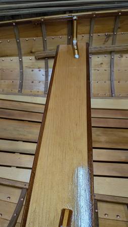 The boat planks are Port Orford cedar, copper - riveted lapstrake-style, over steam-bent White Oak frames. The fore and aft transoms are book-matched Sapele. The keel is protected with a brass keel-shoe, and the bottom has brass wear-strips to protect the bottom when the boat is beached.