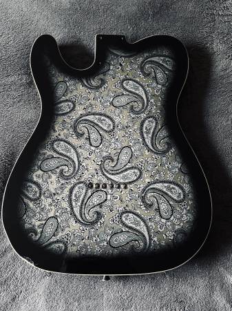 This is an All Parts double bound, black paisley Telecaster body. It's in great condition with a small ding on the back shown in the picture. Includes a clear pickguard and strap buttons. The bridge grounding wire is installed and the cavities are painted with sheilding paint. $150.