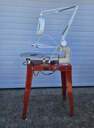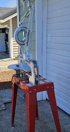 RBI's Patented Camover Tensioning (You can Remove and Re-install blades quickly. Tensioning rod which allows repositioning of blade for inside cuts. Slot in Table top which aids in mounting blade quickly, but doesn't interfere with cutting. Adjustable work table tilts 45 degrees (left or right), Flex bellows which keeps sawdust away from the cutting area (which helps to make more accurate cuts), and so much more. Also included is a lighted magnifier for a more precision view. 120 Volts/98 lbs...Manuels and other paperwork included.