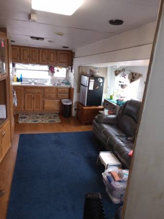 Fifth wheel with a porch in tree and seed trailer park hundred yards from the beach